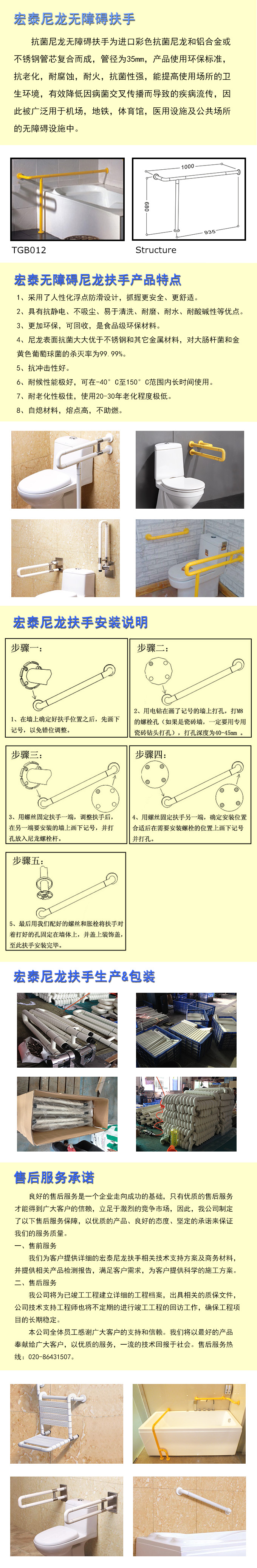 TGB012:浴室用尼龙扶手 1、材质:尼龙外管+铝合金/304不锈钢管芯 2、表面设计:条型防滑设计 3、扶手管径为35mm,颜色为白色、黄色