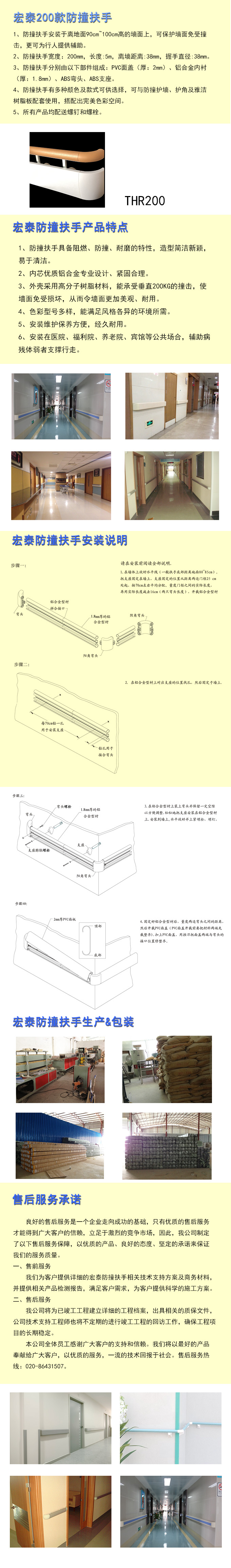 宏泰医用防撞扶手 1.外壳采用PVC高聚氯乙烯材料,抗菌耐磨,使墙面免受损坏,从而令墙面更加美观、耐用; 2.内芯选用优质铝合金专业设计、紧固合理; 3.扶手色彩型号多样、能满足风格各异的环境所需; 4.安装维护保养方便,经久耐用; 5.安装在医院、福利院、养老院、宾馆等公共场合,辅助患者、老人步行