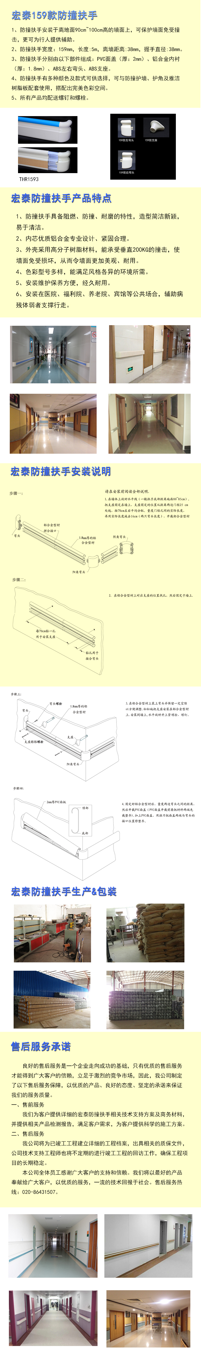 宏泰医用防撞扶手 1.外壳采用PVC高聚氯乙烯材料,抗菌耐磨,使墙面免受损坏,从而令墙面更加美观、耐用; 2.内芯选用优质铝合金专业设计、紧固合理; 3.扶手色彩型号多样、能满足风格各异的环境所需; 4.安装维护保养方便,经久耐用; 5.安装在医院、福利院、养老院、宾馆等公共场合,辅助患者、老人步行。