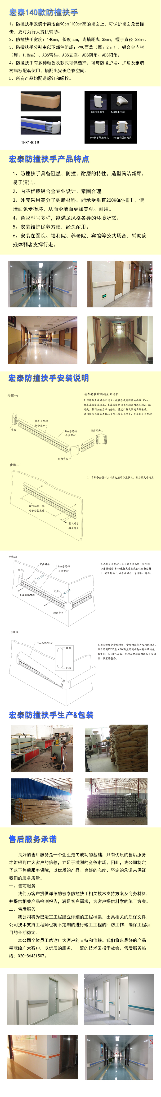 1、防撞扶手具备阻燃、抗菌、耐磨的特性,造型简洁新颖,易于清洁。 2、内芯优质铝合金专业设计、紧固合理。 3、外壳采用高分子树脂材料,能承受垂直200KG的撞击,使墙面免受损坏,从而令墙面更加美观、耐用。 4、色彩型号多样,能满足风格各异的环境所需。 5、安装维护保养方便,经久耐用。 6、安装在医院、福利院、养老院、宾馆等公共场合,辅助病残体弱者支撑行走。