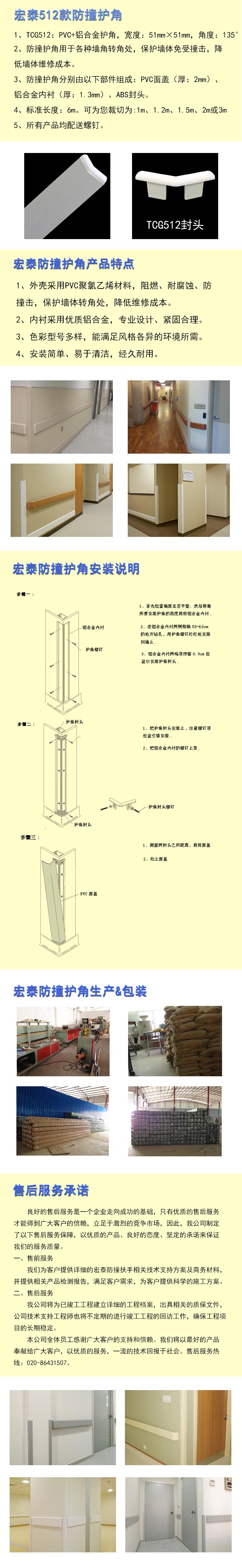 宏泰医用防撞护角 1.外壳采用PVC高聚氯乙烯材料,抗菌耐磨,保护墙体转角处,降低维修成本; 2.内芯选用优质铝合金专业设计、紧固合理; 3.防撞护角具备阻燃抗菌的特性,易于清洁,色彩型号多样,能满足风格各异的环境所需; 4.安装维护保养方便,经久耐用; 5.适用于医院、福利院、养老院、宾馆等公共场合。