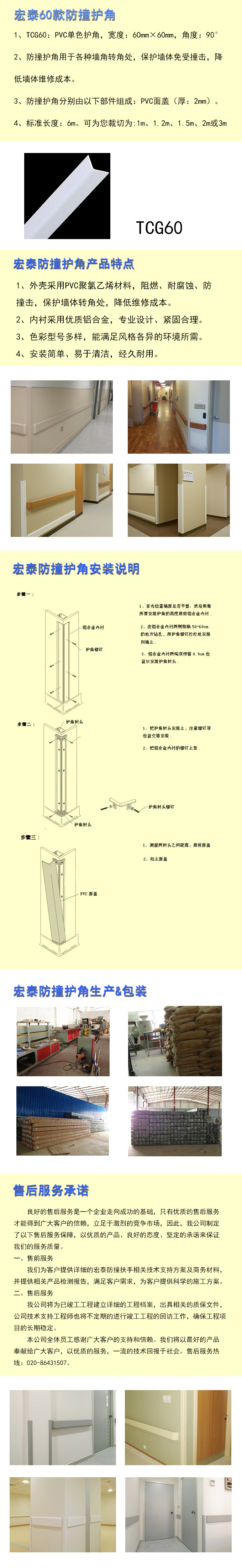 宏泰医用防撞护角 1.外壳采用PVC高聚氯乙烯材料,抗菌耐磨,保护墙体转角处,降低维修成本; 2.内芯选用优质铝合金专业设计、紧固合理; 3.防撞护角具备阻燃抗菌的特性,易于清洁,色彩型号多样,能满足风格各异的环境所需; 4.安装维护保养方便,经久耐用; 5.适用于医院、福利院、养老院、宾馆等公共场合。