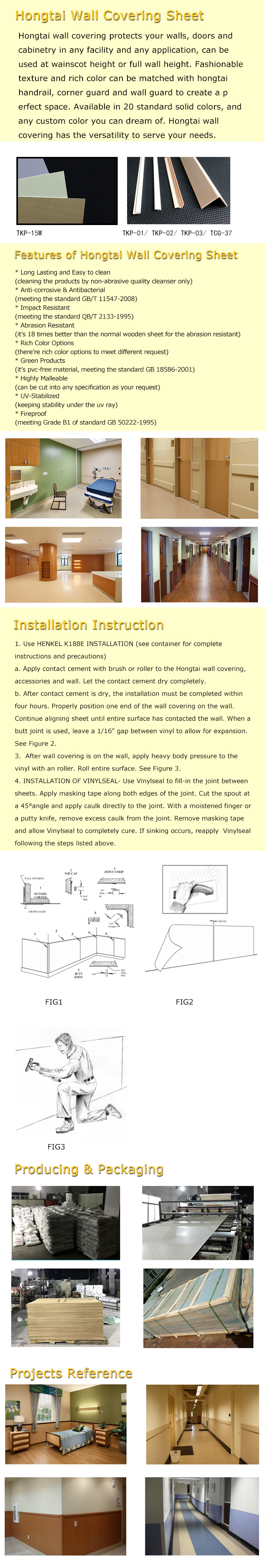 • product description:Hongtai Wall Covering can be designed in different fashionable and high-end style to create a perfect space. It’s usually used on: Hotel, Restaurant , Shopping Mall, Airport, School, Subway Station, Stadium HallFactory, Office building, Kitchen. The excellent performance is popular for Hospital Corridor, Patient Room, ICU and Clinic.