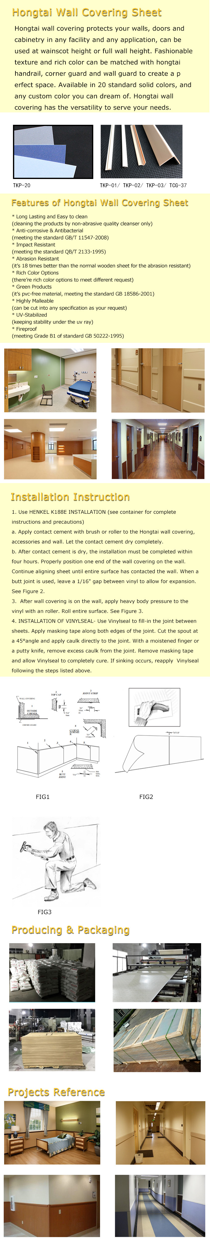 • product description:Hongtai Wall Covering can be designed in different fashionable and high-end style to create a perfect space. It’s usually used on: Hotel, Restaurant , Shopping Mall, Airport, School, Subway Station, Stadium HallFactory, Office building, Kitchen. The excellent performance is popular for Hospital Corridor, Patient Room, ICU and Clinic.