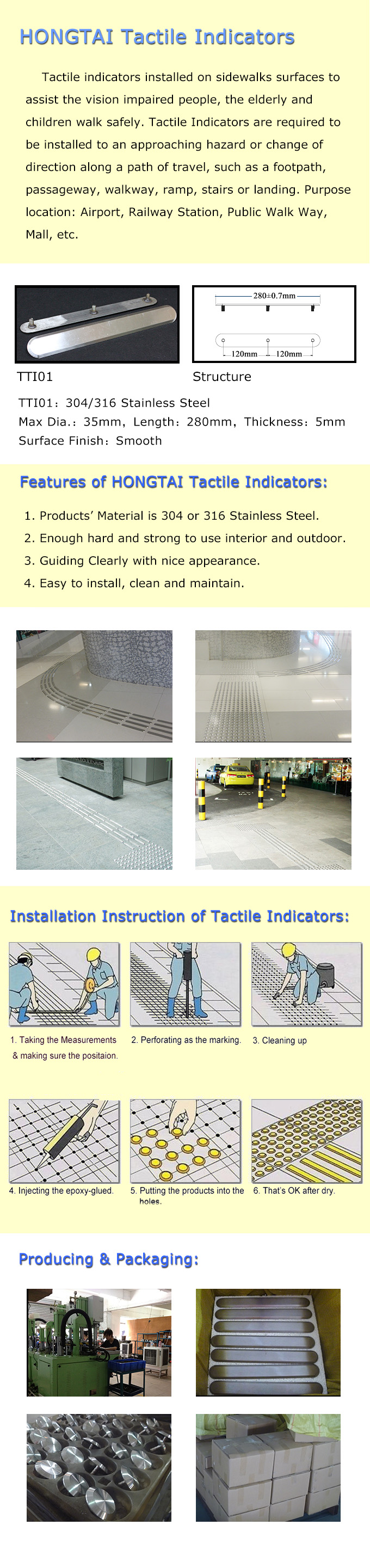 • product description:Tactile indicators installed on sidewalks surfaces to assist the vision impaired people, the elderly and children walk safely.Tactile Indicators are required to be installed to an approaching hazard or change of direction along a path of travel, such as a footpath, passageway, walkway, ramp, stairs or landing. Purpose location: Airport, Railway Station, Public Walk Way, Mall, etc.