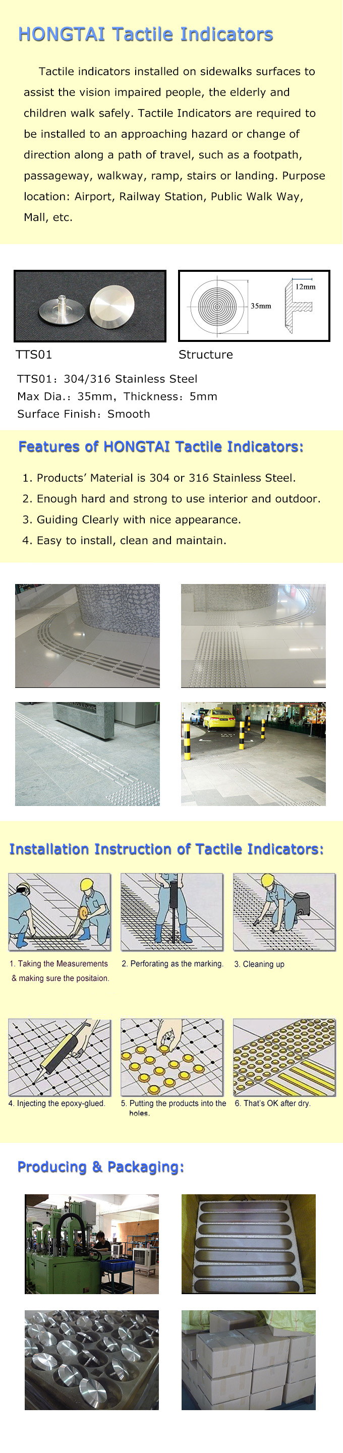 • product description:Tactile indicators installed on sidewalks surfaces to assist the vision impaired people, the elderly and children walk safely.Tactile Indicators are required to be installed to an approaching hazard or change of direction along a path of travel, such as a footpath, passageway, walkway, ramp, stairs or landing. Purpose location: Airport, Railway Station, Public Walk Way, Mall, etc.