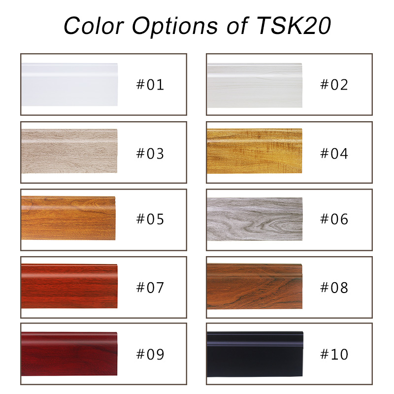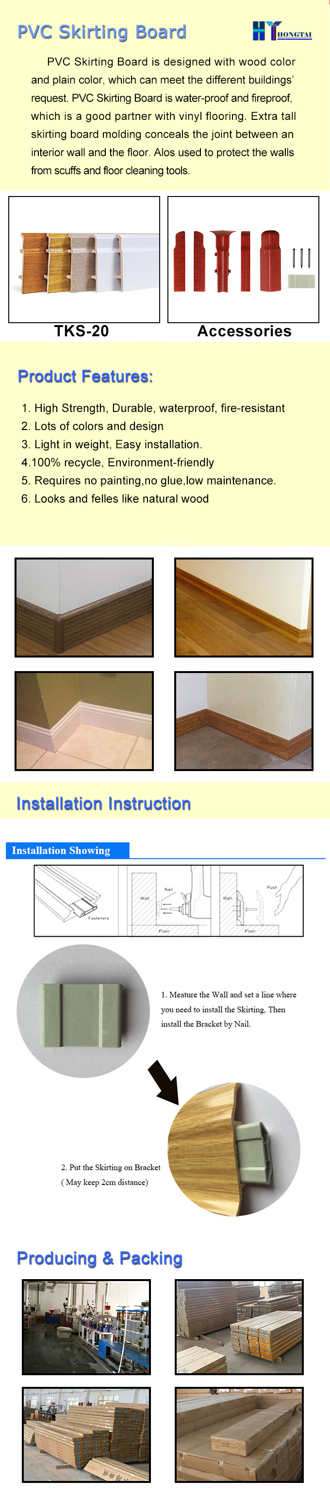 request. PVC Skirting Board is water-proof and fireproof,which is a good partner with vinyl flooring. Extra tall skirting board molding conceals the joint between an interior wall and the floor. Alos used to protect the walls from scuffs and floor cleaning tools.